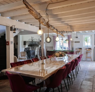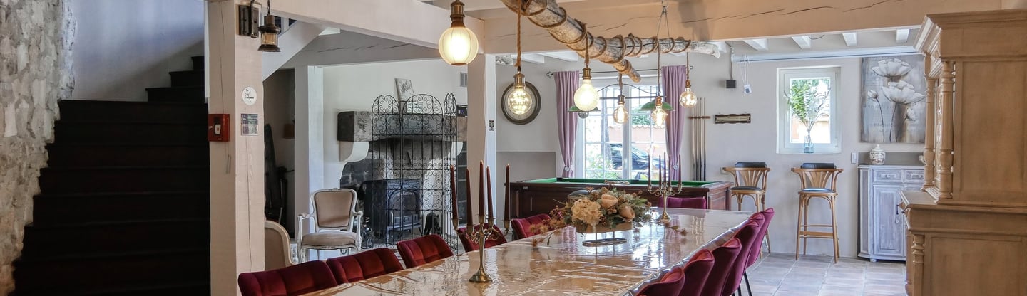 Grande table originale en chêne, éclairage original bois flotté, billard, cave à bières & à vin, espace dégustation, vidéo projecteur Home Cinéma, tourne disque/ radio/ CD/ cassette rétro (100 aine de disques vinyles) climatisation