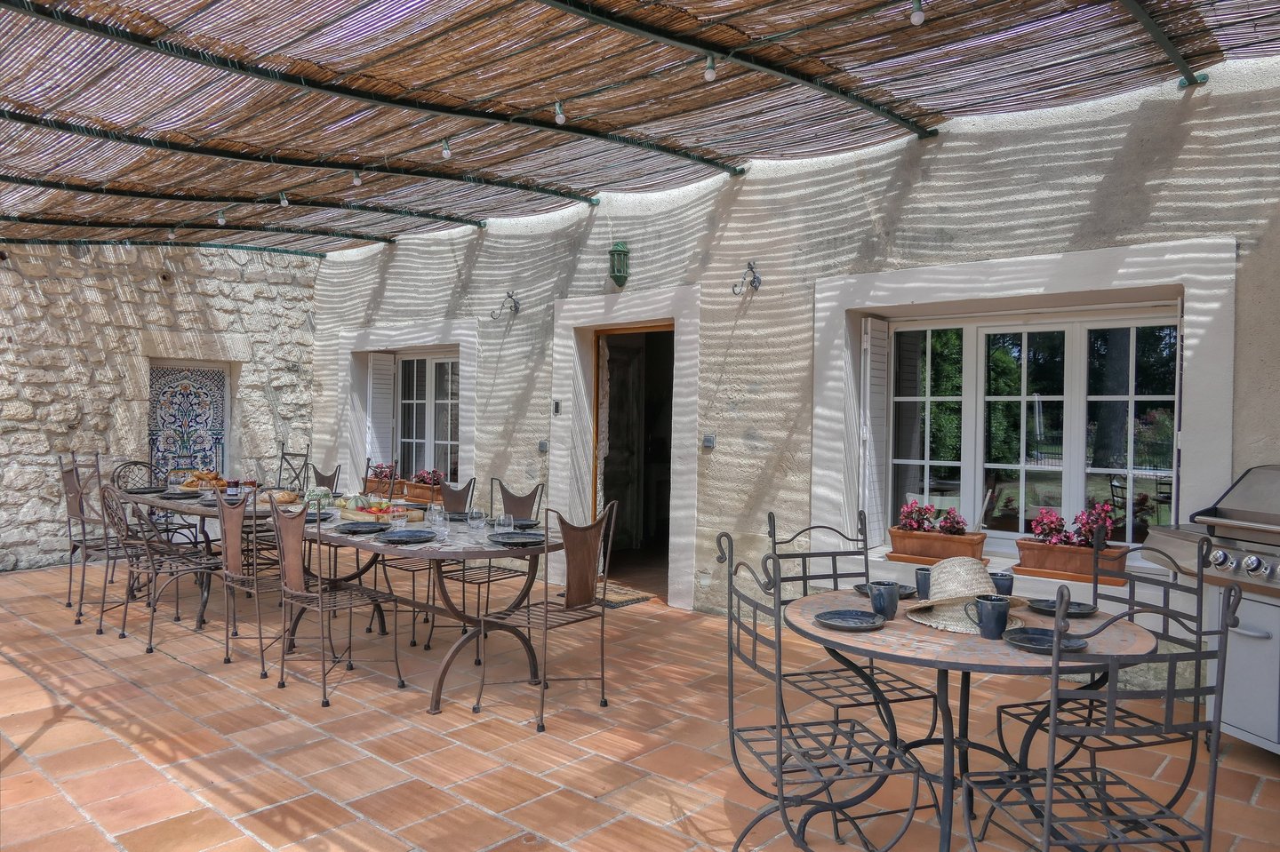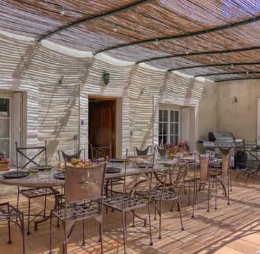 Les espaces communs sont vastes et accueillants : une salle à manger conviviale avec poêle à bois, un salon lumineux, un bureau, une mezzanine avec espace détente et jeux, et une buanderie équipée. En extérieur, vous découvrirez une grande terrasse équipée de tables en fer forgé mosaïques, un pool house avec coin bar, salon ombragé, et salle de bain extérieure.