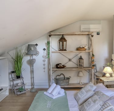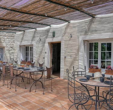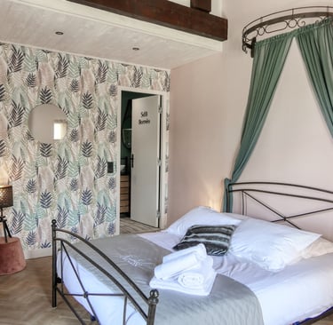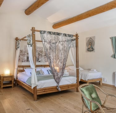 Le mas se compose de 6 chambres à thème, chacune décorée avec soin : Tara, Narcisse, Iris, Neptune, Gaïa et Sylvanus. Chaque espace a son identité, sa palette de couleurs, et dispose d’une literie de qualité. Vous y trouverez également 4 salles de bain, toutes pensées dans un esprit de confort et de bien-être (Bali, Bornéo, Atlantis, Capri), ainsi que 5 WC répartis dans la maison pour un usage fluide en groupe.